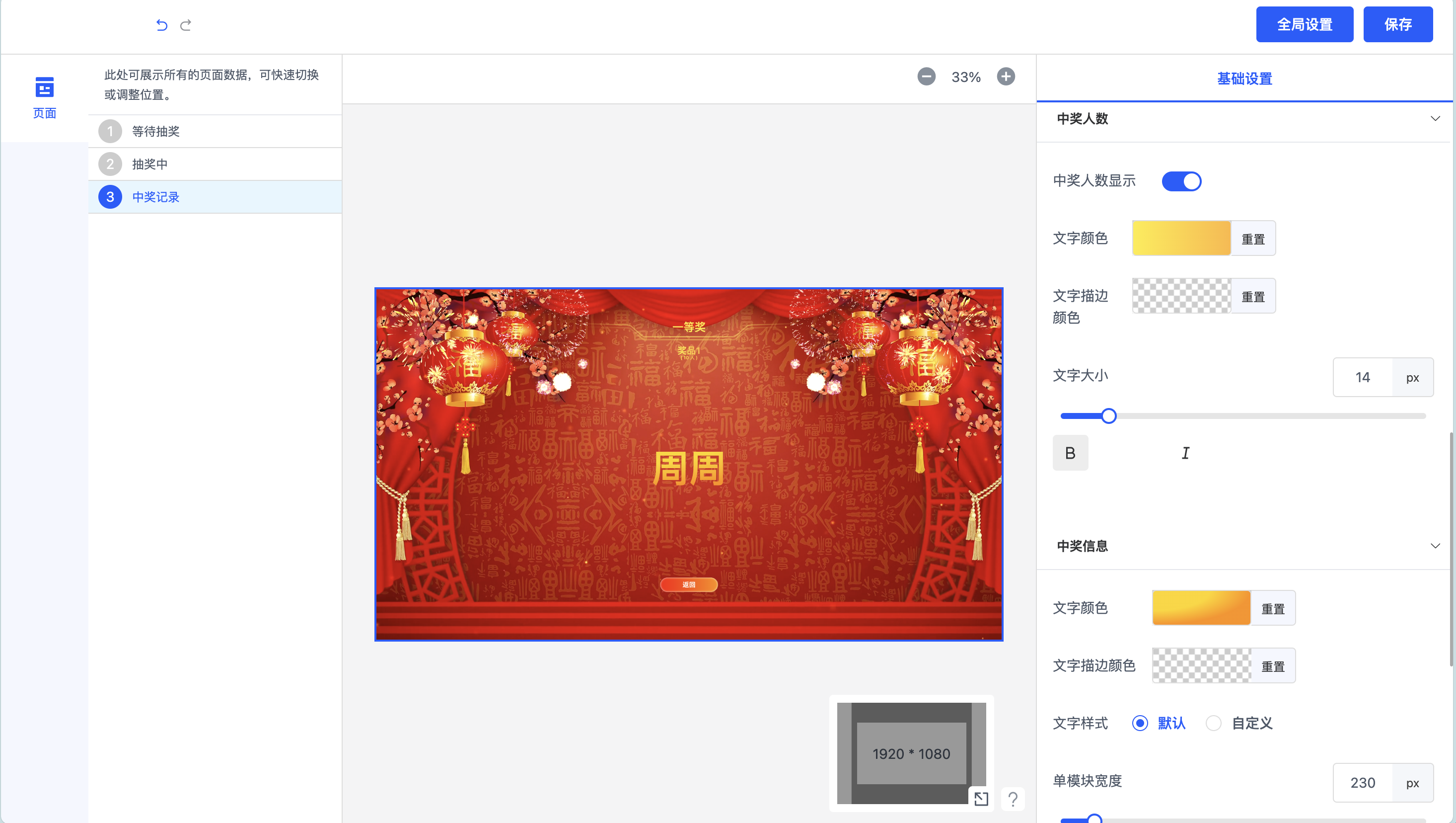 中奖结果:支持对中奖界面背景音乐、中奖烟花素材、装饰素材信息、中奖信息的颜色大小等细节信息进行diy设计。