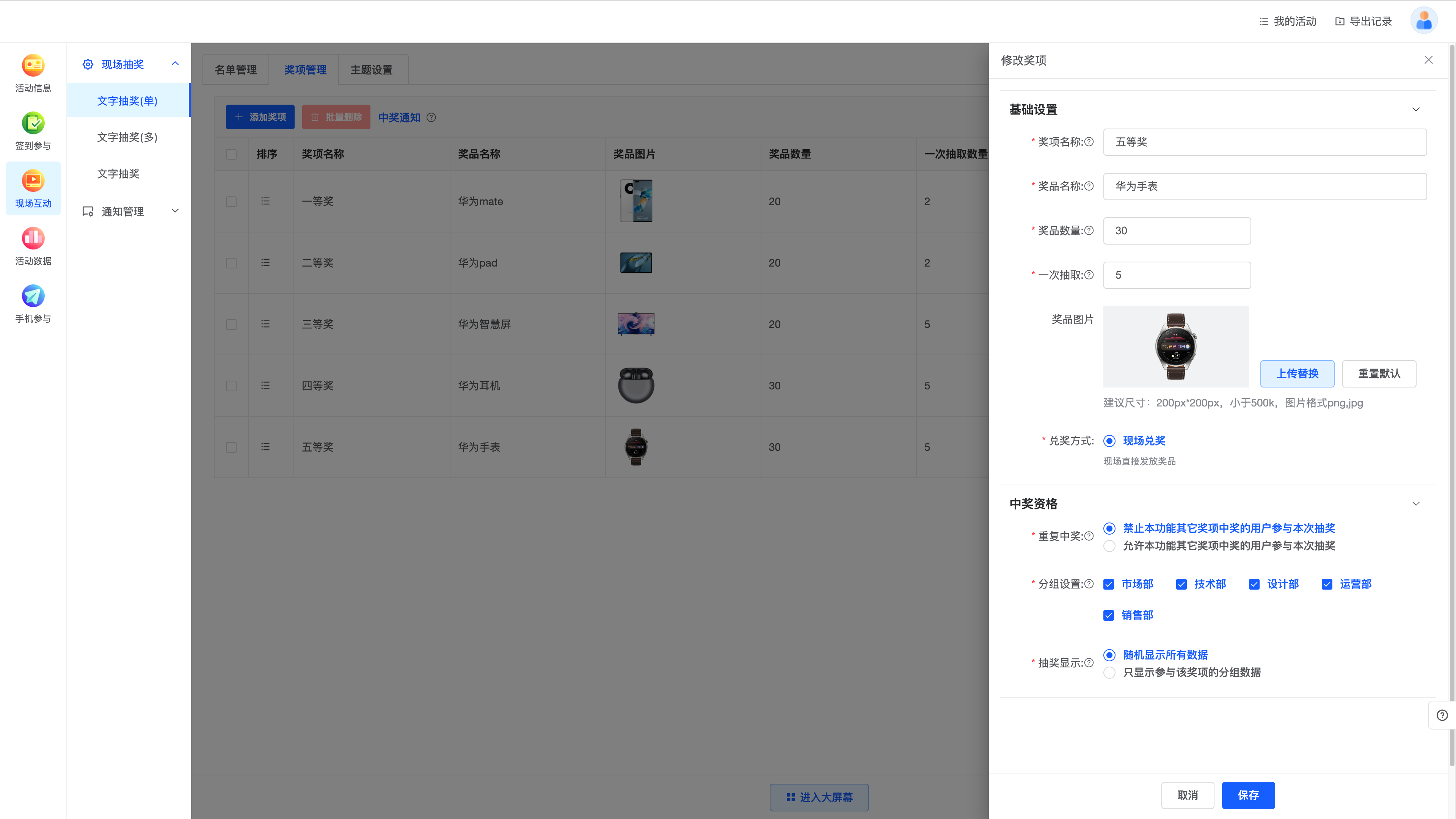 支持设置多种奖项,一次可抽取多名幸运者,满足各种奖项需求。