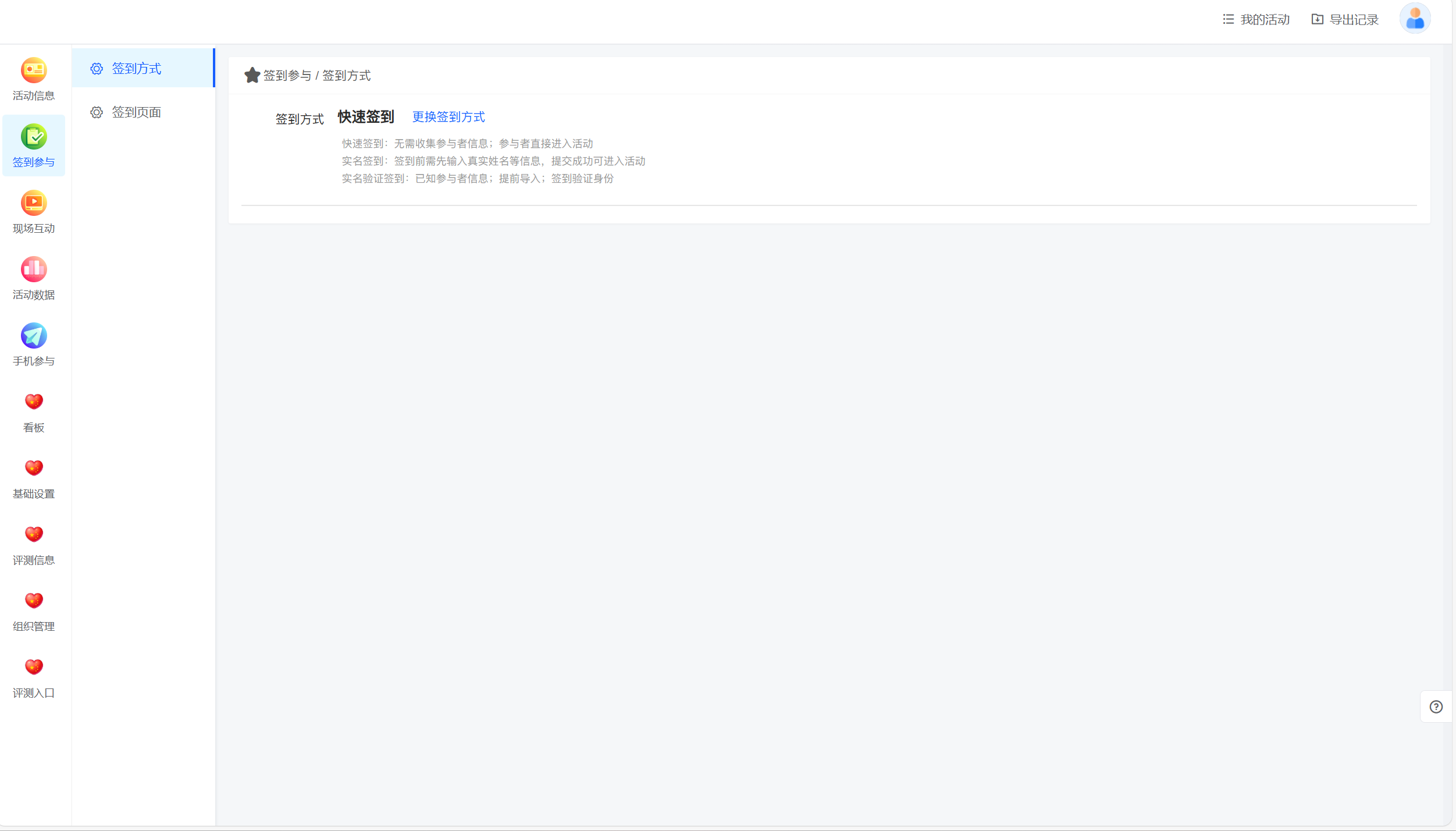1.签到方式设置:主办方提前在后台设置适合活动的签到方式。