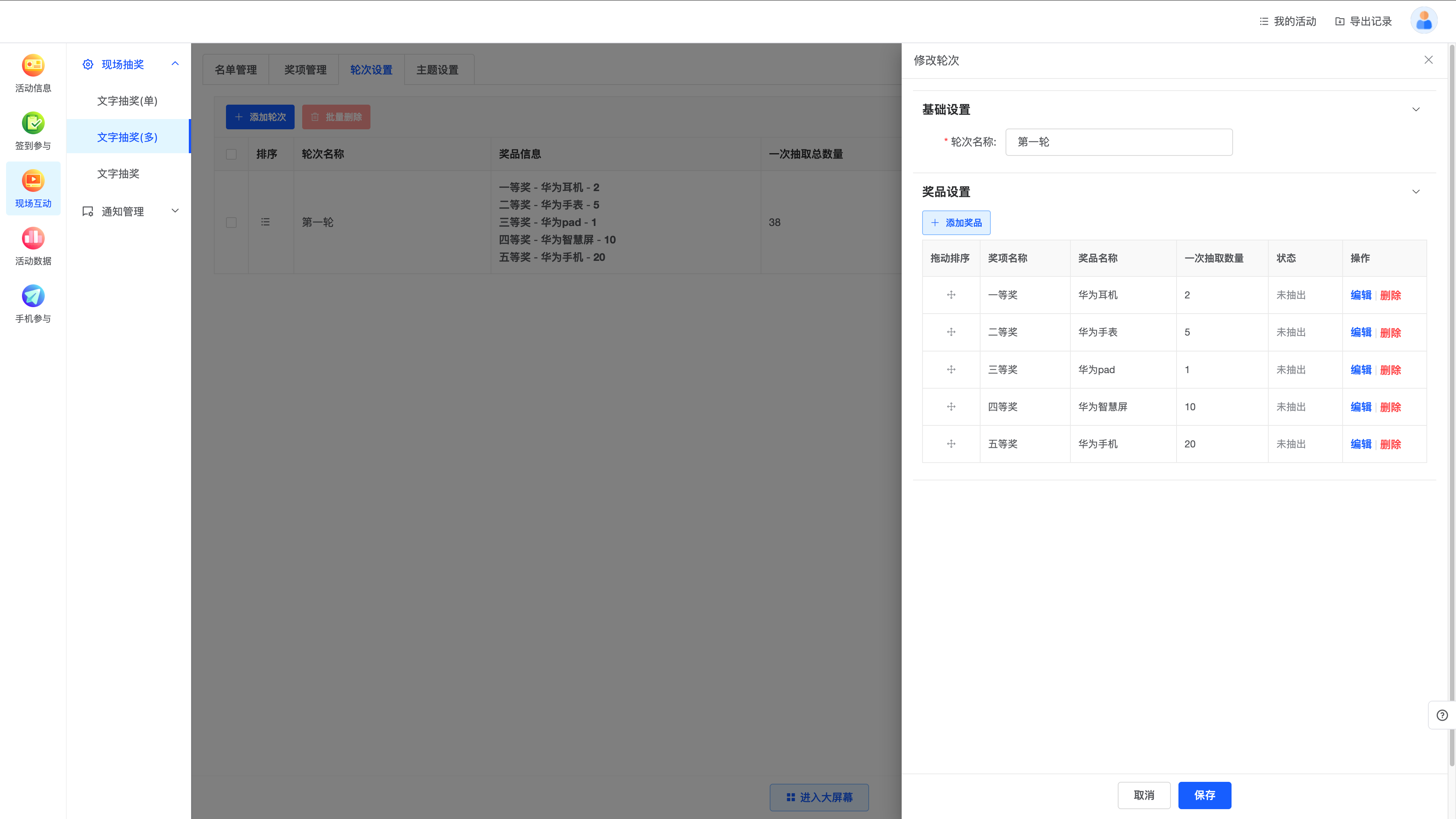 主办方可以根据需求设置不同的奖品和抽奖轮次,灵活控制奖品派发数量和中奖次数。可以通过系统后台轻松添加和配置不同的抽奖轮次,每个轮次支持独立的奖项数据管理,可以根据活动的需求,灵活调整每轮的奖品设置和参与者名单,确保活动流程的顺利进行。