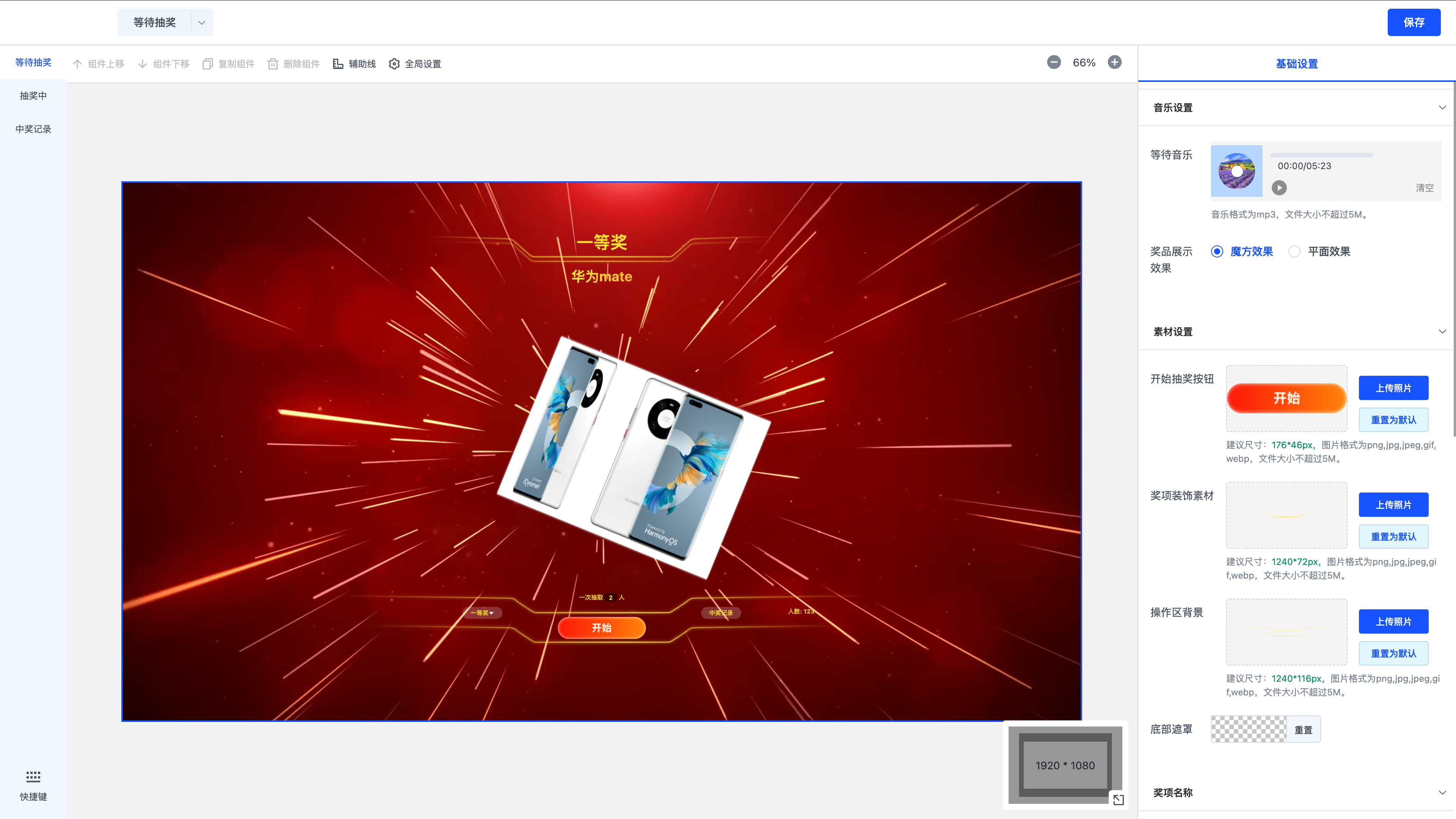 等待抽奖:支持对等待抽奖界面背景音乐、奖品展示3D效果、装饰素材信息、奖项名称颜色大小等细节信息进行自定义修改,创建独一无二的活动。
