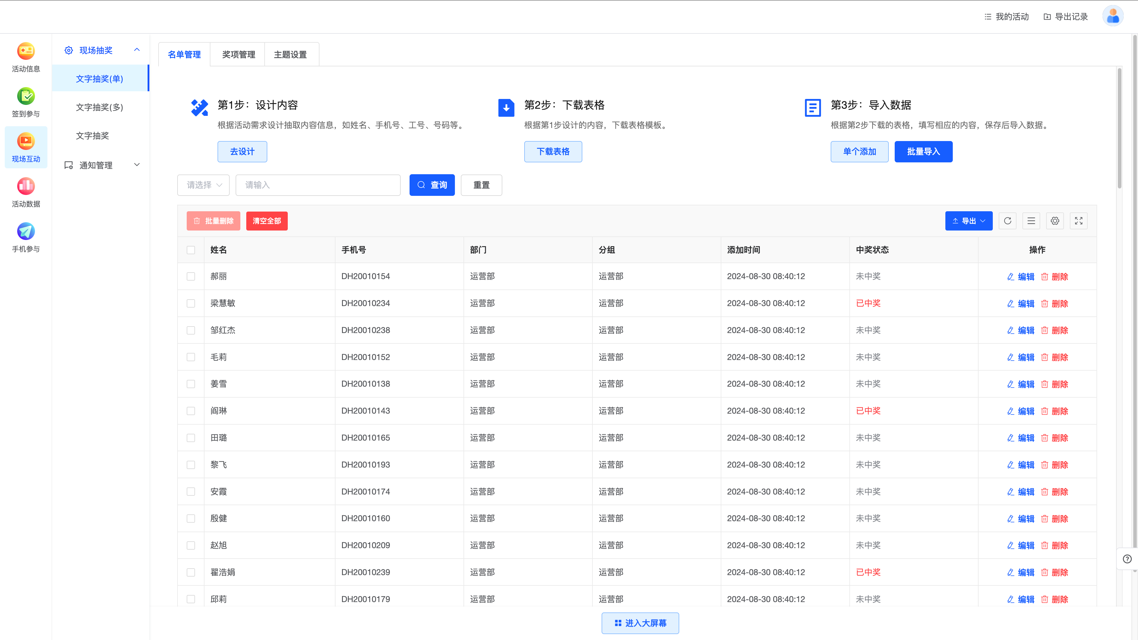 信息批量导入:支持通过后台系统批量导入参与者信息,包括文字、数字、姓名、电话等类型信息,简化数据输入过程。