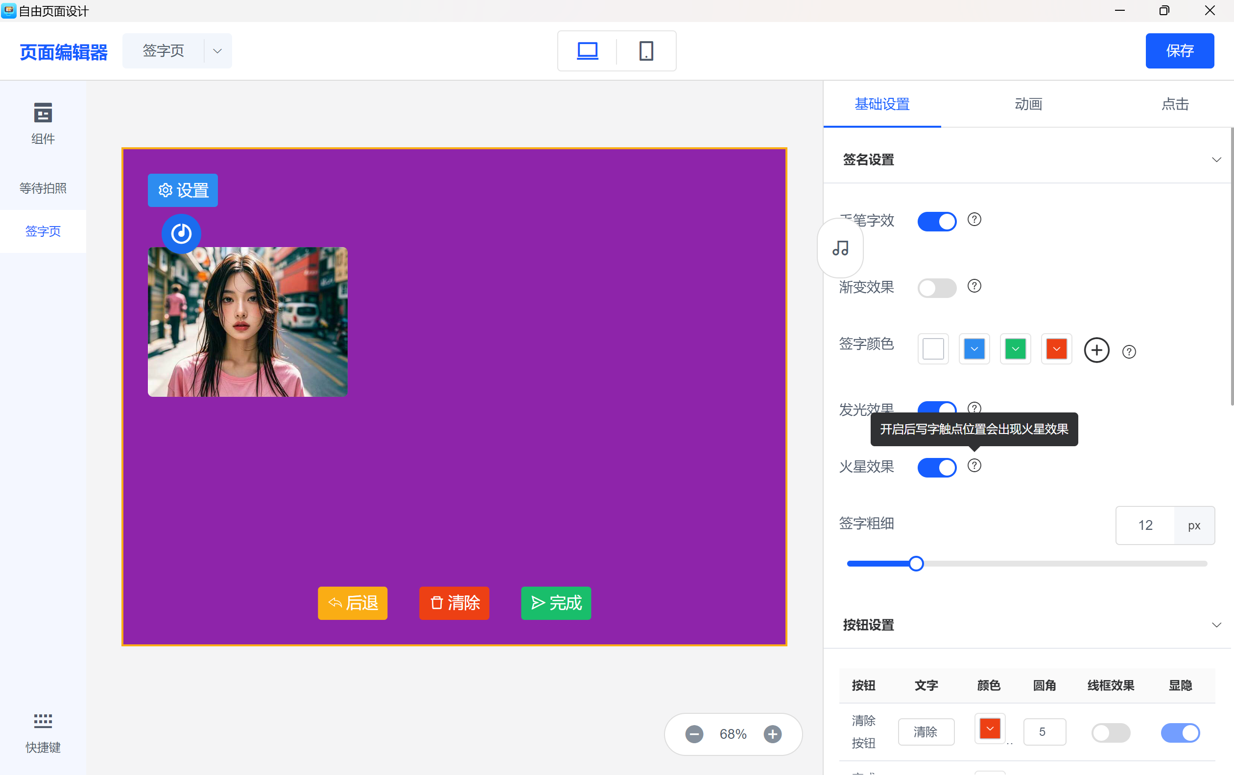 多种签名效果:支持毛笔字、渐变色、发光和火星效果,调整签名粗细,满足不同活动风格。