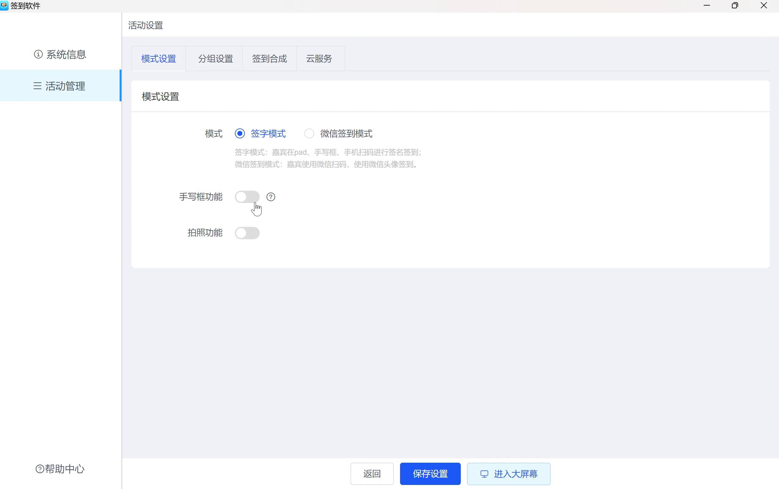 签字模式:支持在iPad、手写框上进行签名签到,提供手写框功能,增强现场体验。