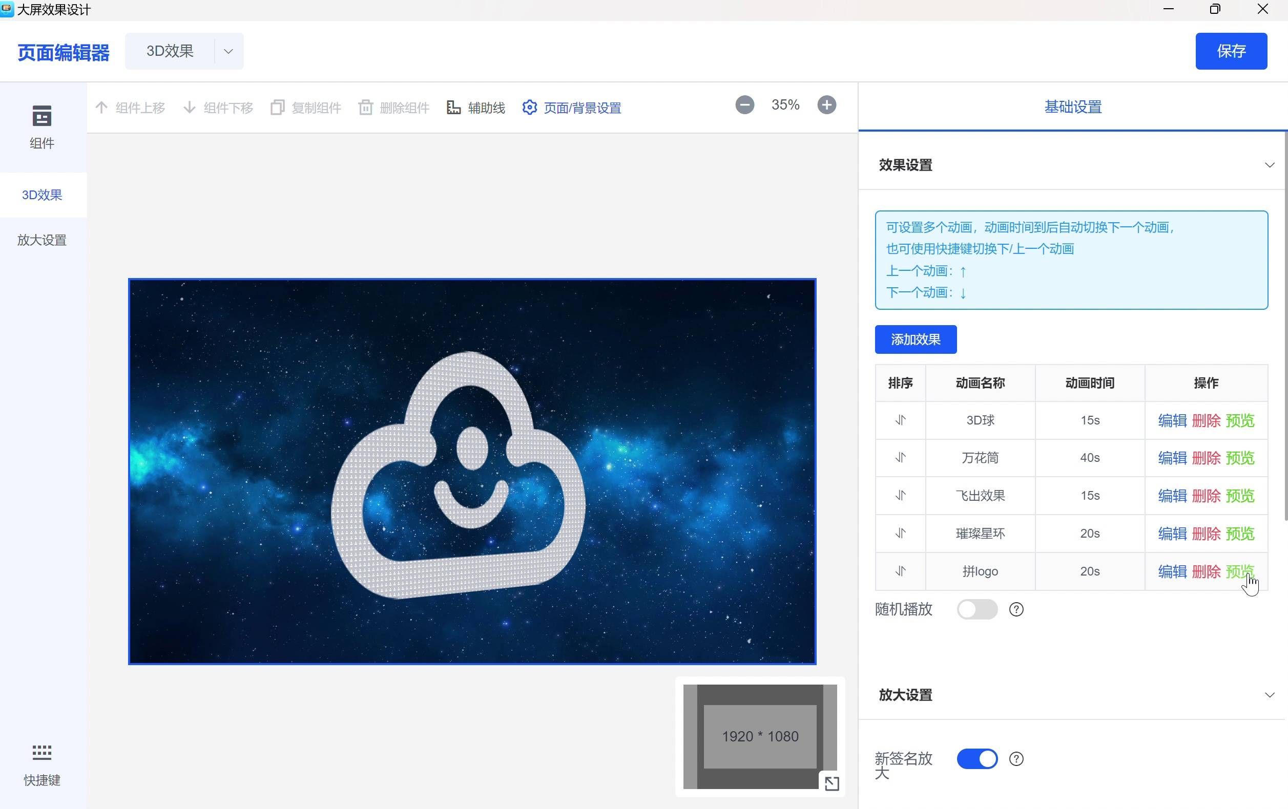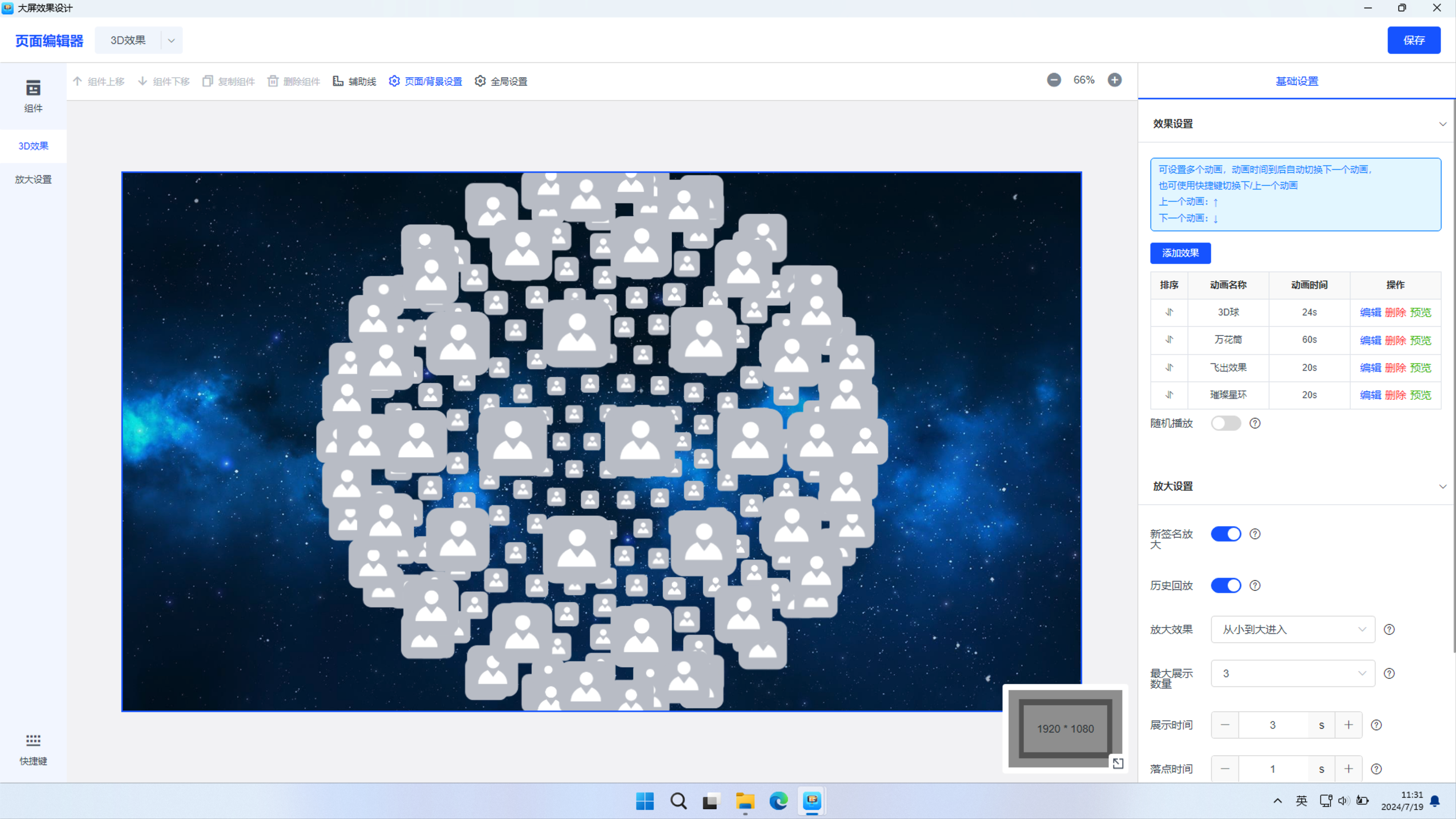 3D动态展示:点击预览页面,出现效果设置,可添加动画、设置动画展示时间、历史回放、放大规则等功能,增强现场互动。其中3D动态效果有3D球、万花筒、飞出效果、璀璨星环、自定义效果(根据上传的图片拼成指定的内容)。