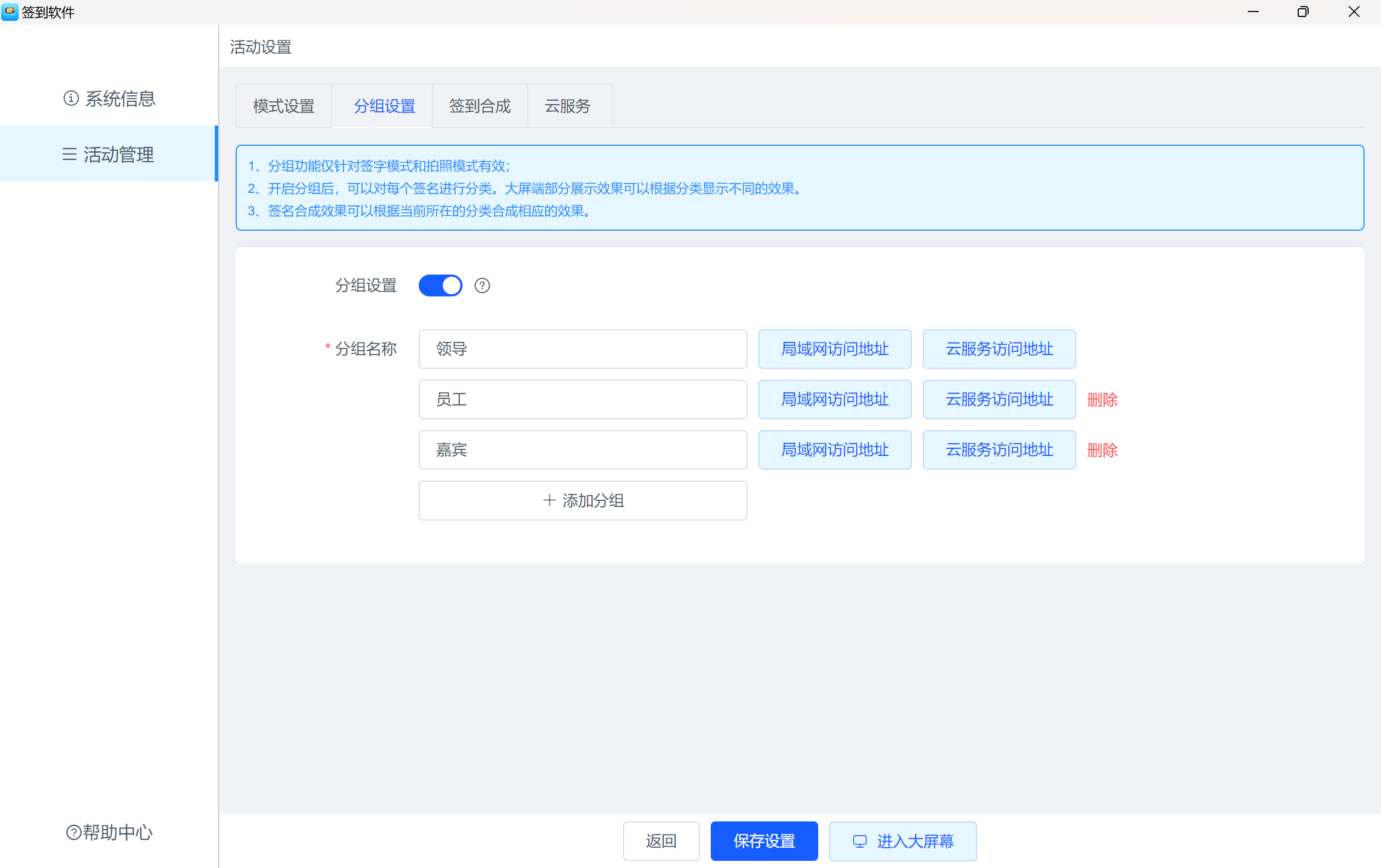 在签字和拍照模式下,进行分组管理,按分组展示不同的签到效果。