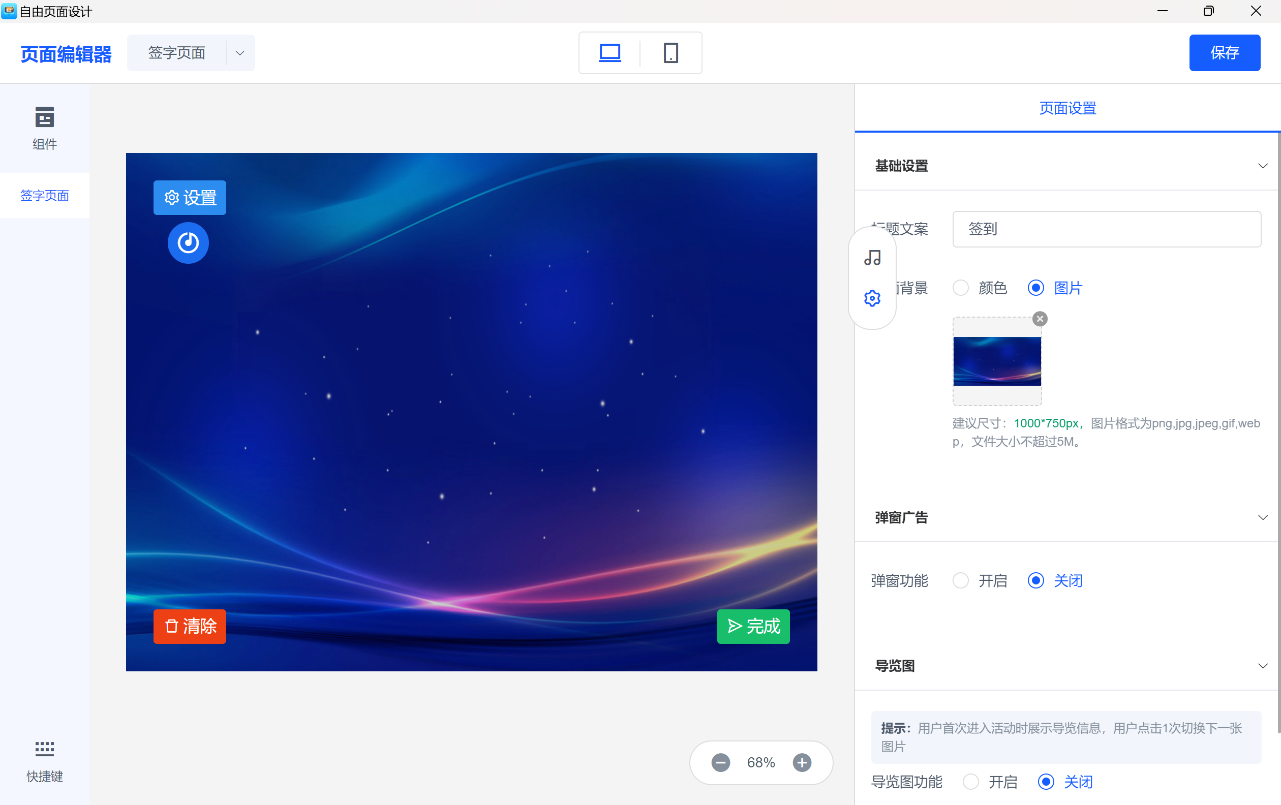 点击页面设计,进行用户端设置。不同模式和规则下,用户端效果需单独设置,可编辑签字端效果,可修改背景、字体类型、签字颜色、签字粗细等。微信签到模式无用户端设置,该模式下修改用户端,需到第三方平台进行设置。注意:手机或pad打开,页面会强制横屏显示。