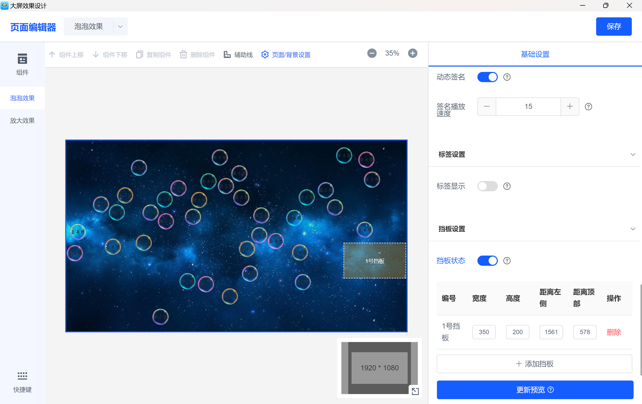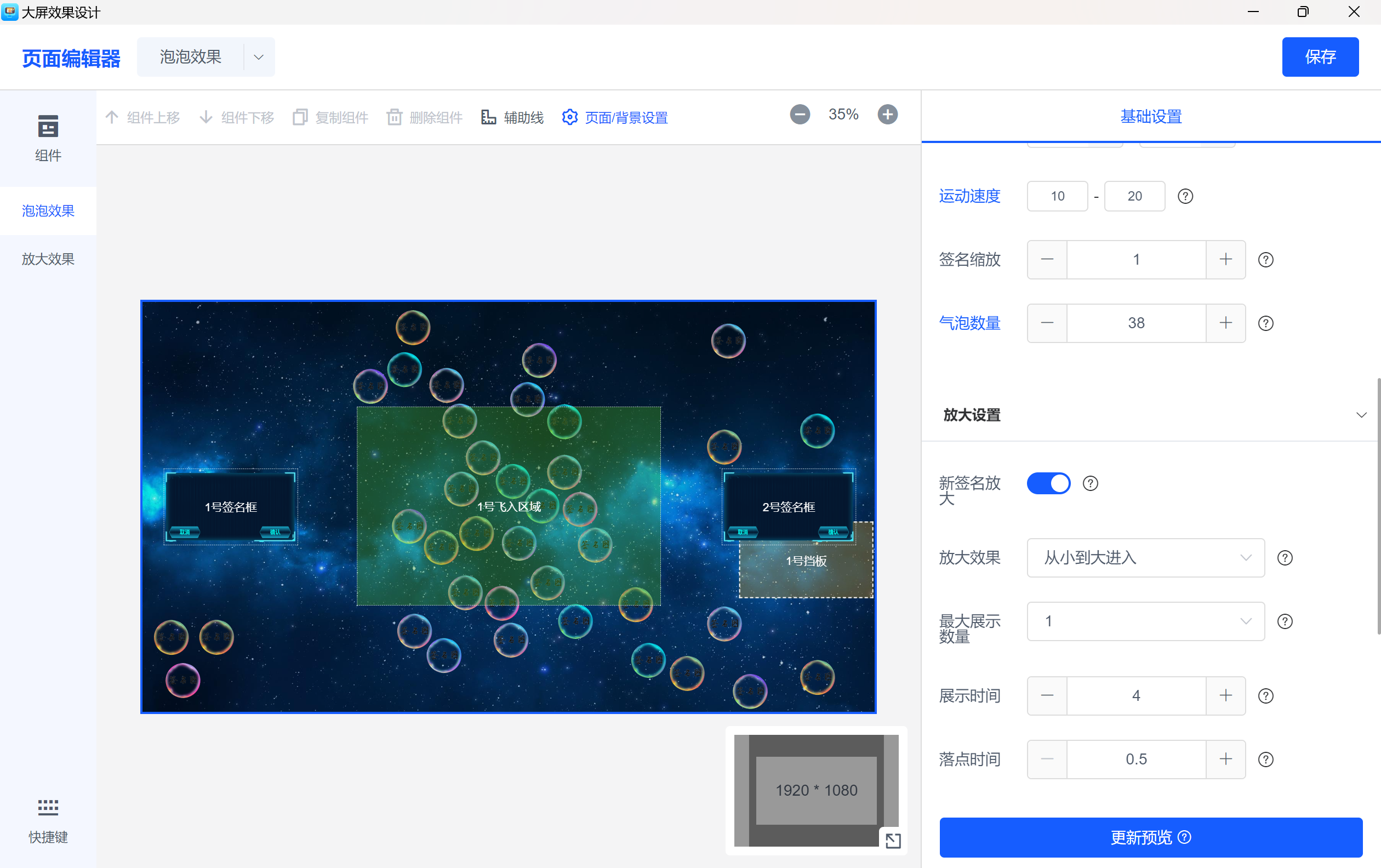 泡泡效果设置:设计泡泡动画,支持运动速度、碰撞变色、球体旋转、气泡数量等功能设置,增加签到过程的趣味性。