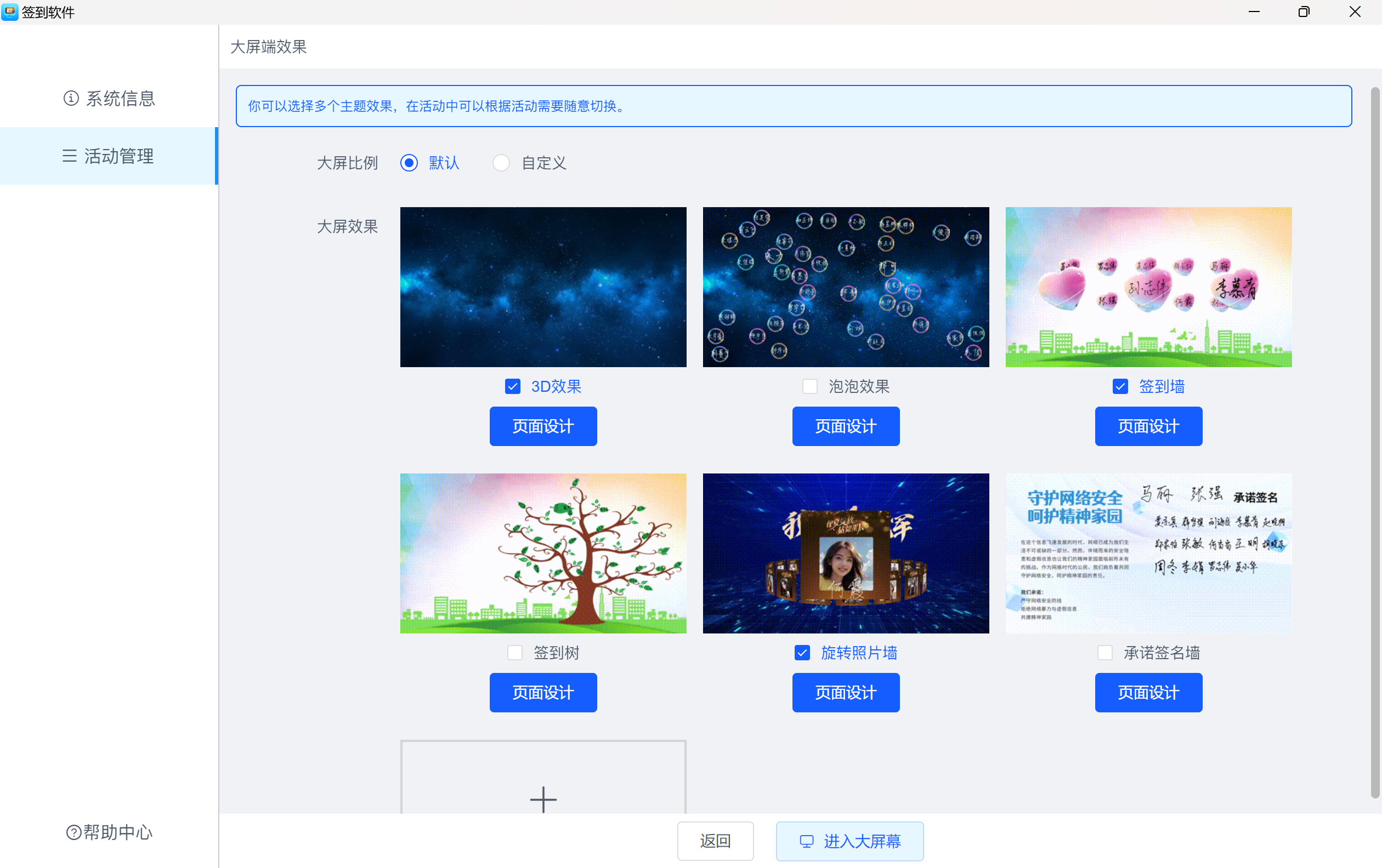 多主题效果:提供3D互动、泡泡效果、签到树、签到墙等多种效果,可以选择多个主题效果,在活动中可以根据活动需要随意切换,提升视觉冲击。