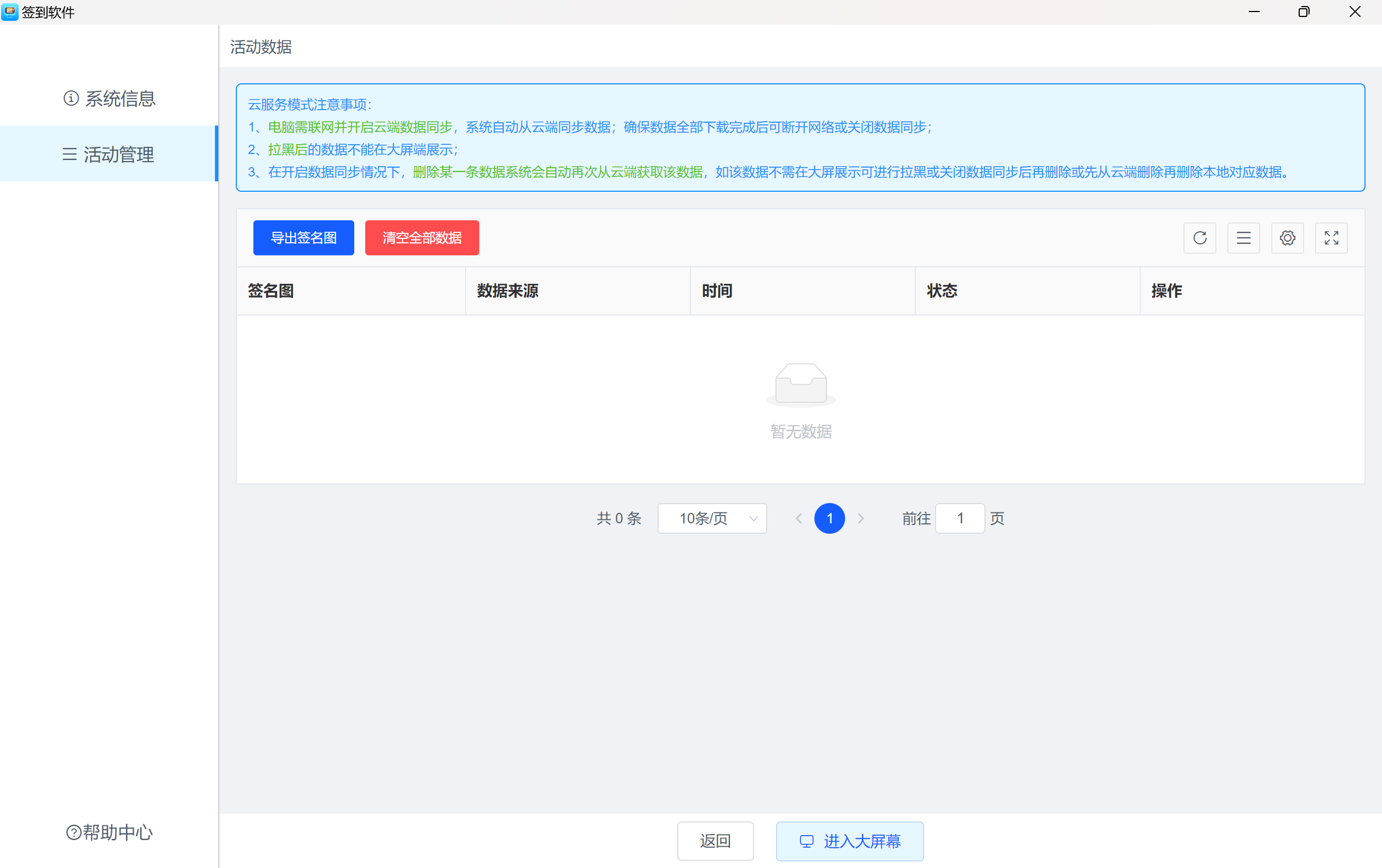 云服务模式:电脑需联网并开启云端数据同步,系统自动从云端同步数据;确保数据全部下载完成后可断开网络或关闭数据同步;在开启数据同步情况下,删除某一条数据系统会自动再次从云端获取该数据,如该数据不需在大屏展示可进行拉黑或关闭数据同步后再删除或先从云端删除再删除本地对应数据。