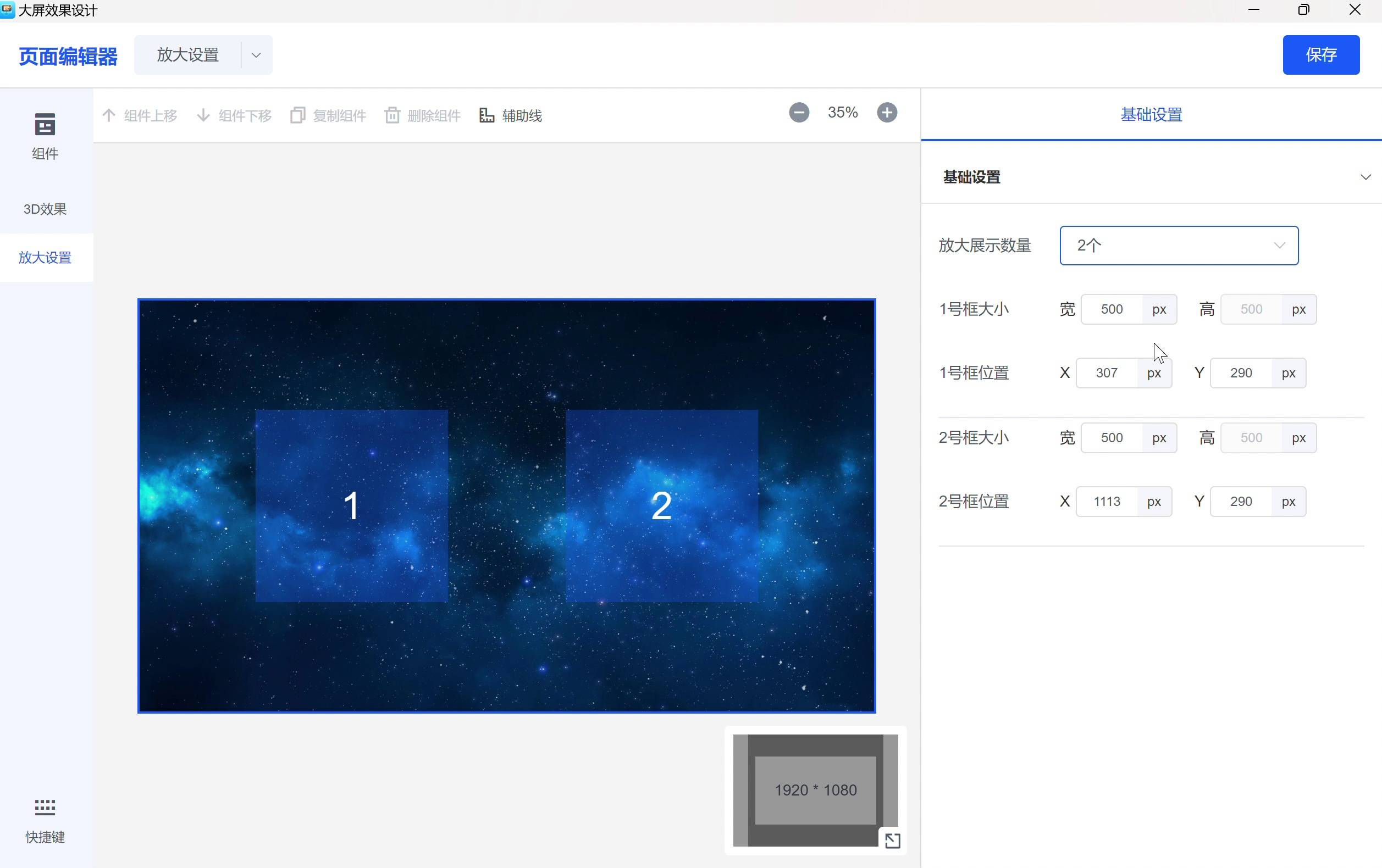 放大规则设置:放大位置设置切换放大展示数量,可设置不同放大数量时,大屏端放大展示效果的尺寸和位置。