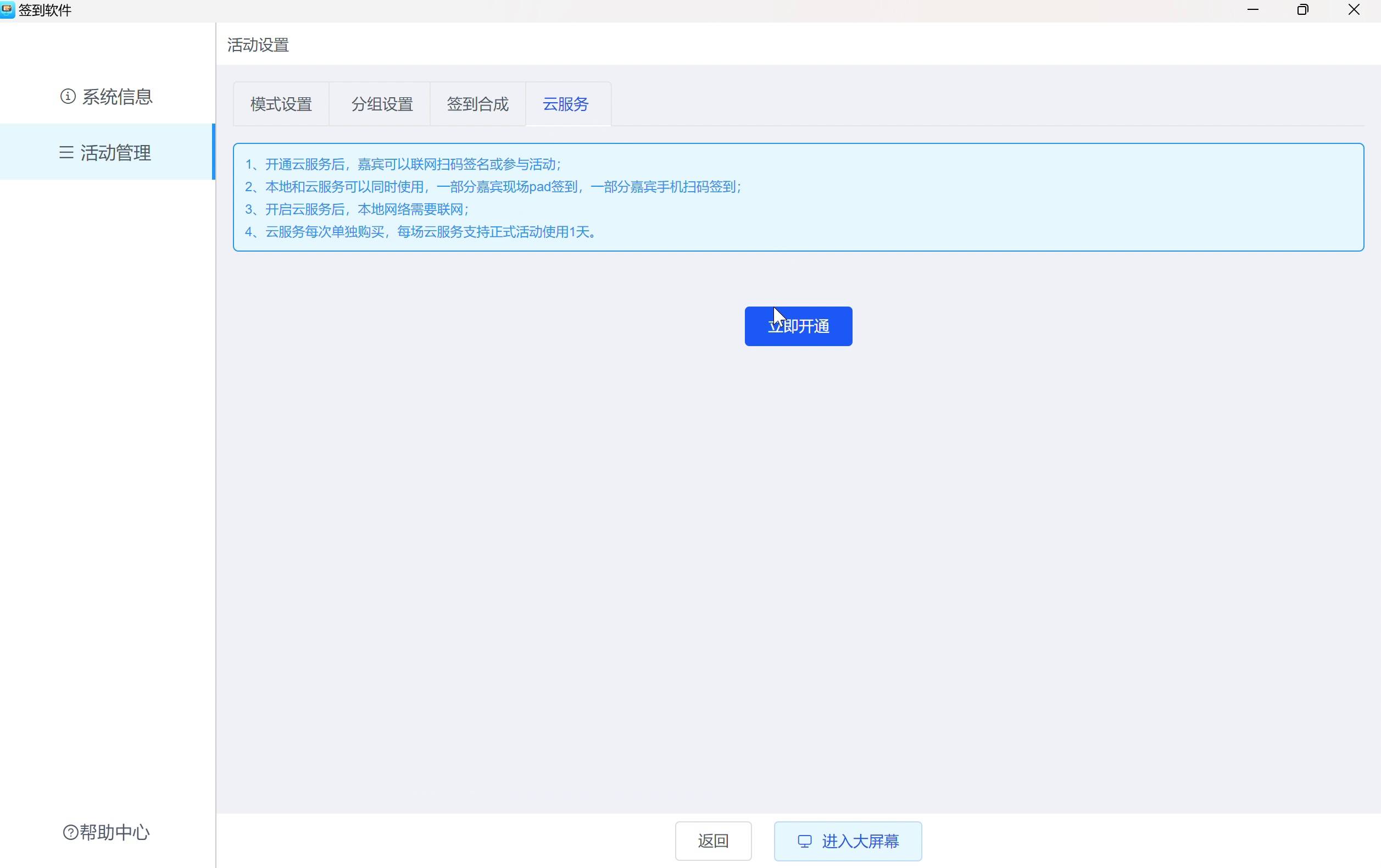 开启云服务后,可以通过互联网入口进入,进行签名等,数据实时同步到软件。开启后,本地和云服务可以同时使用,一部分嘉宾现场pad签到,一部分嘉宾手机扫码签到。