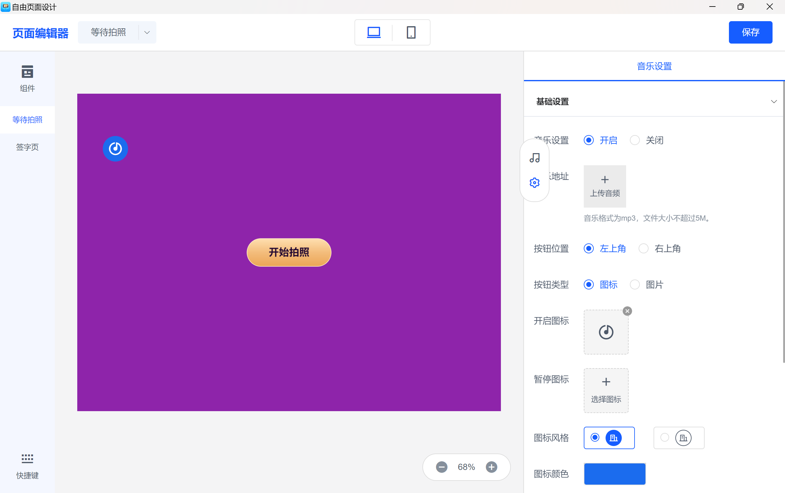 可设置页面背景,点击设置按钮,可设置用户端背景、音乐、标题等;