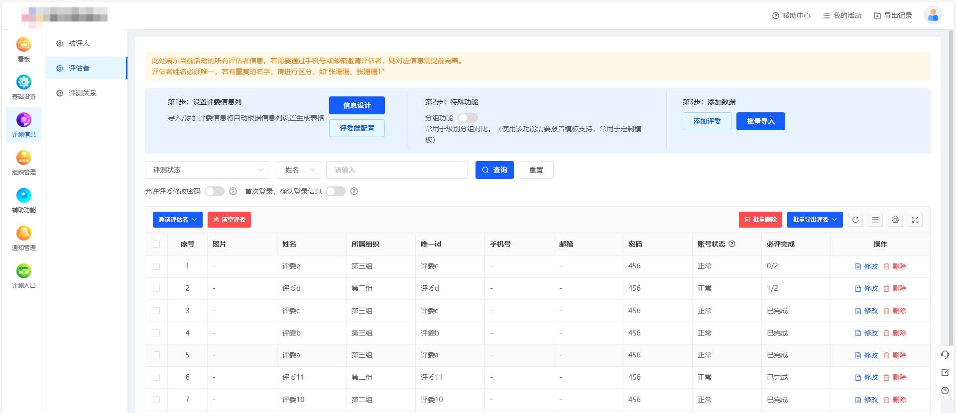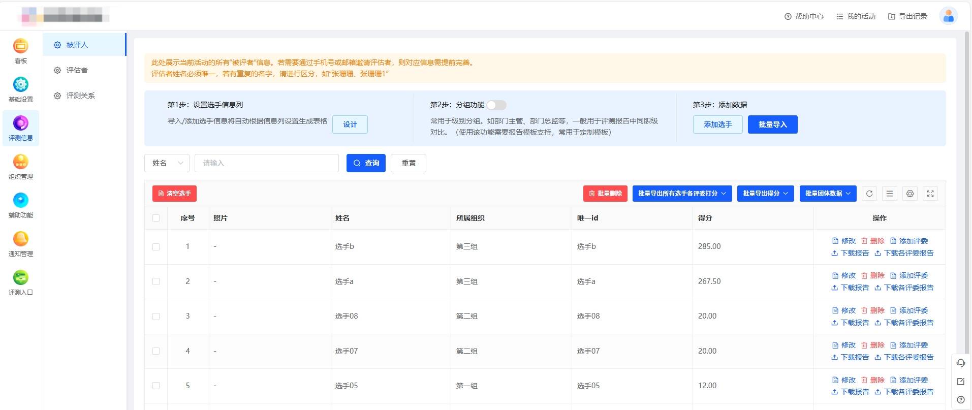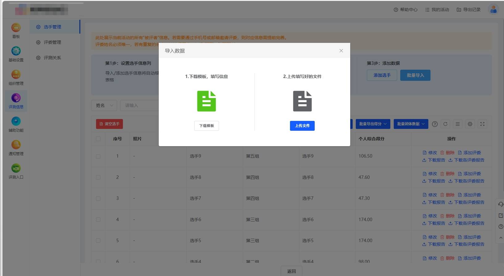 方案支持批量导入选手、评委和评测关系,可以有效提高工作效率。