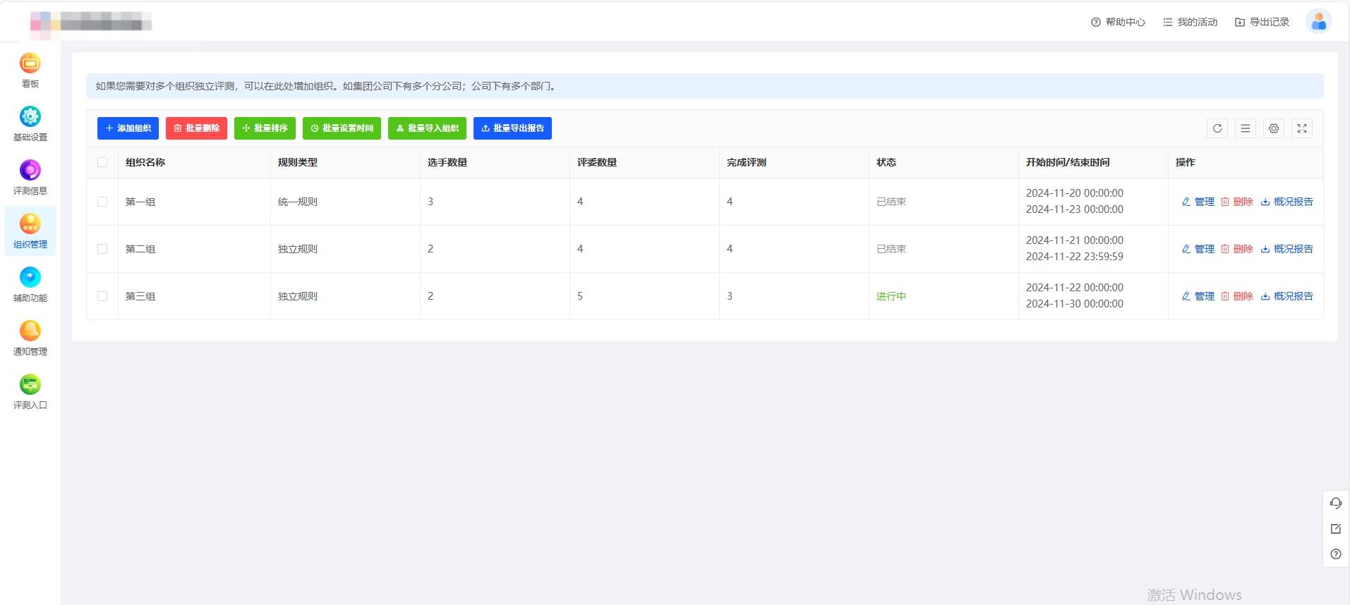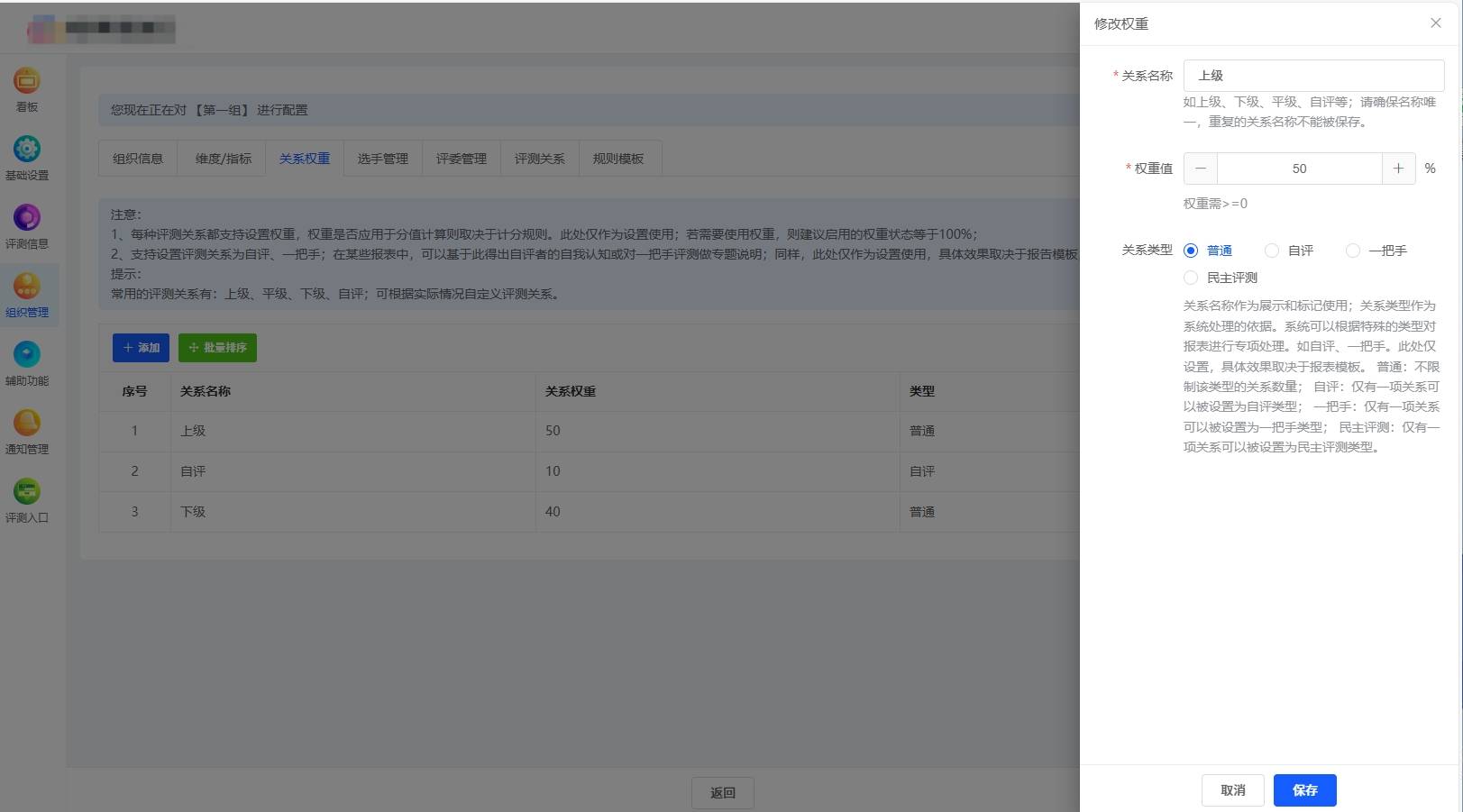 支持对评委进行分组,可以根据不同的部门、项目或者考核维度来设置不同的组织,每个组织可以使用独立的时间、打分规则、维度、指标、关系和权重。