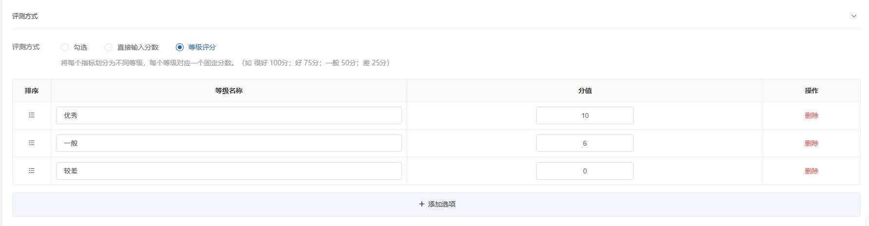 方案内置多种评测方式,如勾选打分、直接输入分数、等级评价。可根据需要选择合适的评测方式。