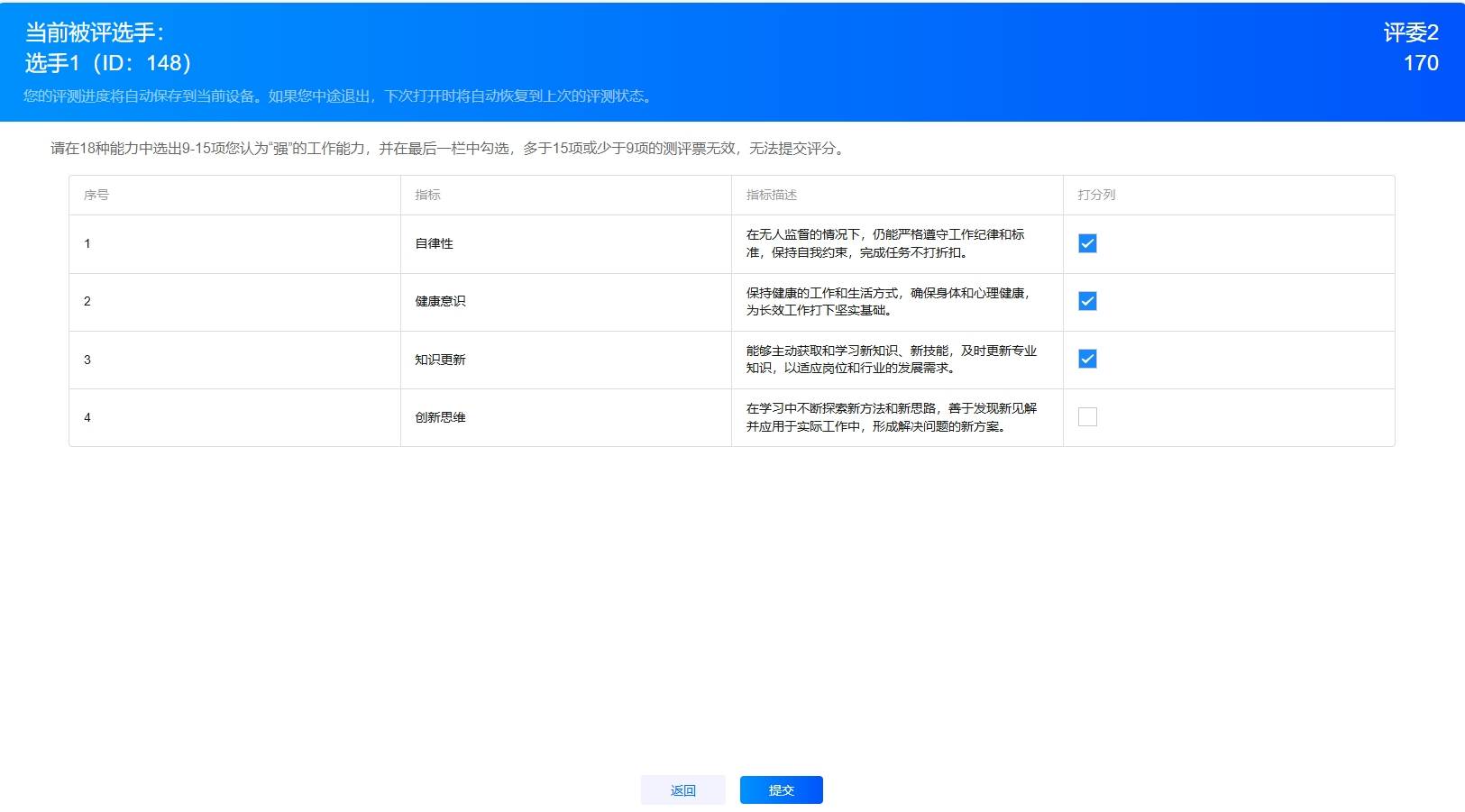 为了保证评价的公平性,一般会对评委打分的提交规则进行一定的限制,开启提交限制后,可以从数量、分数两个方便限制评委的评价,评委在对某一选手的所有打分完成后必须满足该规则才可以成功提交,这样保证了考核评价的公平性和科学性。