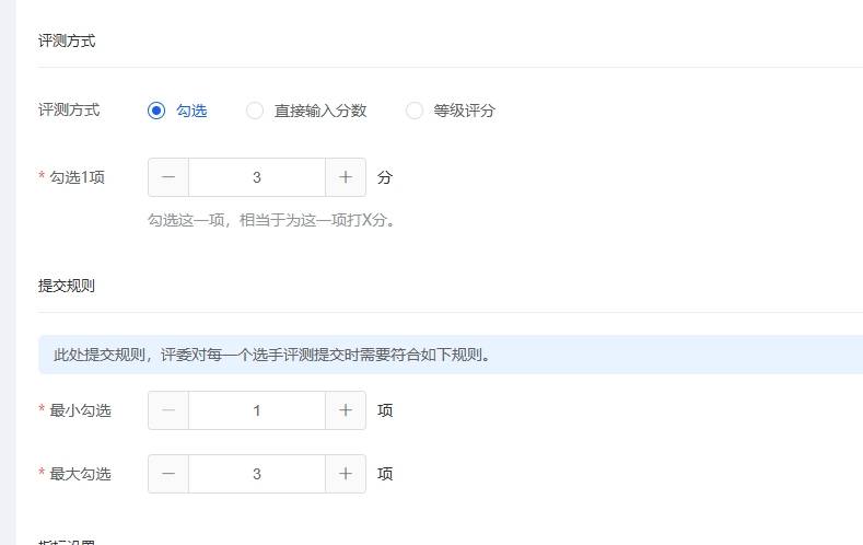 直接输入分数:评委在规则范围内直接输入相应的数字作为该项的原始分数,同时支持对每个指标的打分进行统一和单独的限制。
