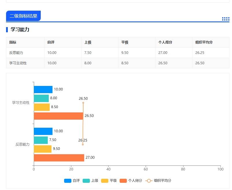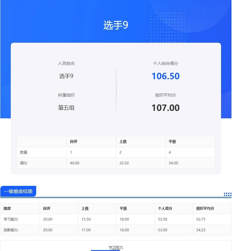 系统支持自动生成个人评测报告,可以在线查看某位员工的报告。报告内容为被评人的最终得分、组织平均分、各个维度/指标不同评测关系的的打分情况,被评人员所在组织的得分分布情况等,包含直方图、雷达图、对比图、表格等各种展示方式。