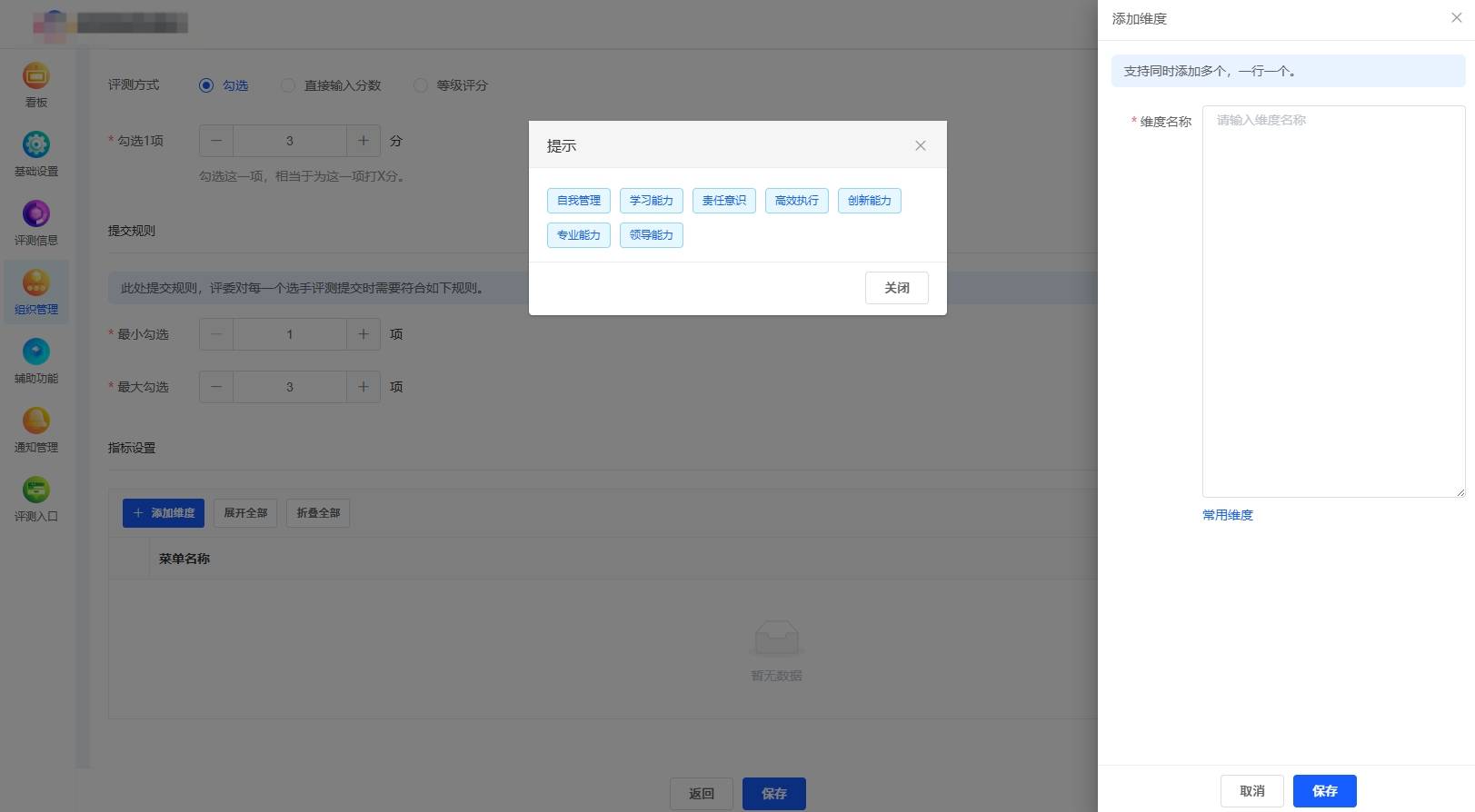 1.设置多种评测方式:HR在后台发起考核打分活动,设置好名称和时间范围,导入参与人员并设置好维度、指标以及选择的评测方式(勾选打分、直接输入分数、等级评价)。