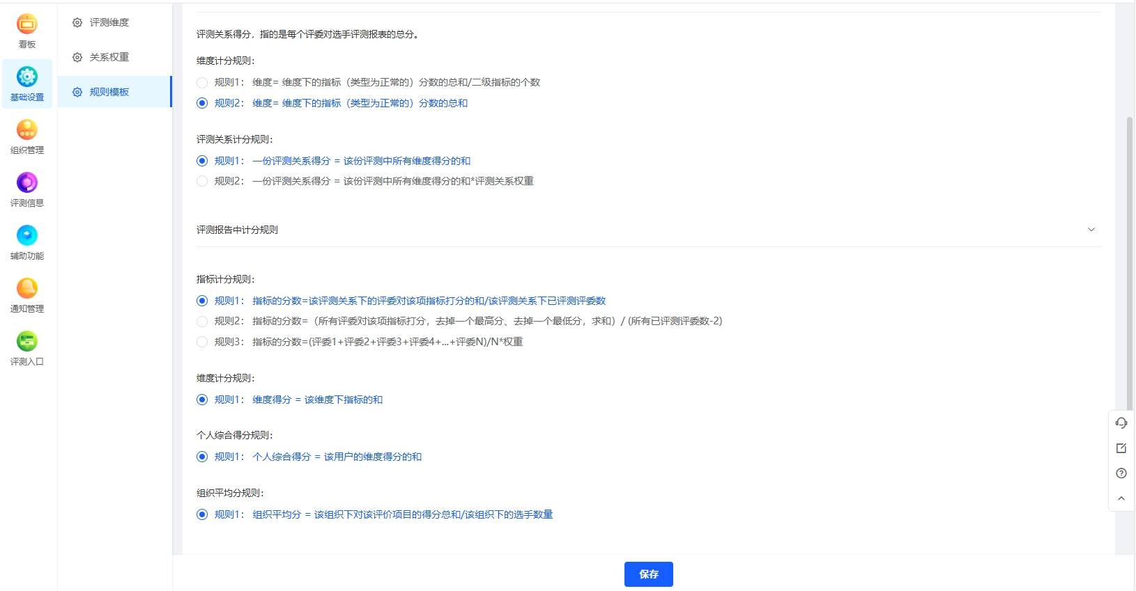 方案支持不同种类的计算规则,用户可以根据自身的需要选择其中一种规则,可以根据组织不同选择不同的规则,也可使用统一规则。选择后该评价活动的所有计分则会按照已选规则模版进行。