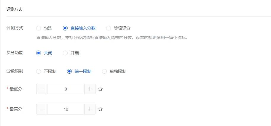 评委在规则范围内直接输入相应的数字作为该项的原始分数,同时支持对每个指标的打分进行统一和单独的限制。